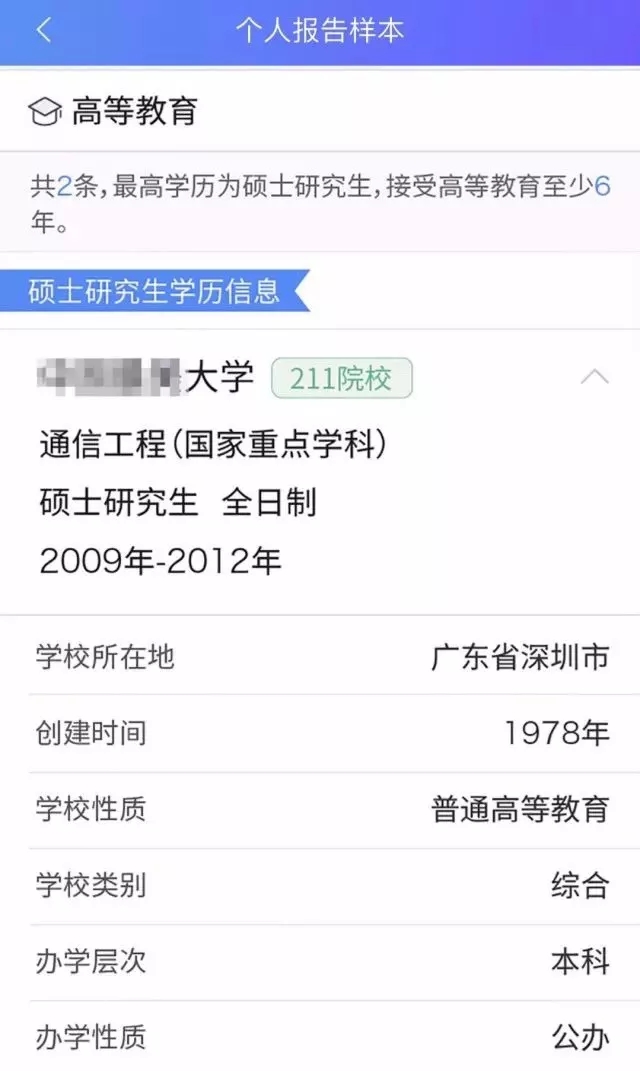 以上为教育信息和职业资格信息这两个部分,要知道学历是银行决定发放多少额度给你很关键的一个因素,学历越高,往往发放的额度也会越高,报告中学校名称,以及录取的批次都能一目了然,提供的信息十分全面、准确。