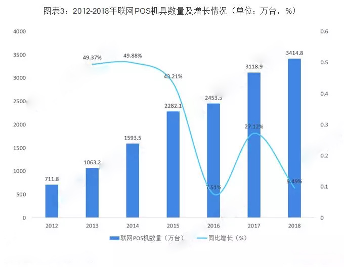 受理市场环境不断完善。截至2018年末,我国联网POS机具共有3414.82万台,较上年增长295.96万台,全国每万人对应的POS机具数量245.66台,同比增长8.91%,全国联网POS机数和联网商户数的持续增长为智能POS收单发展提供了广阔空间,智能POS对于第三方支付收单市场具有重要的业务升级作用。