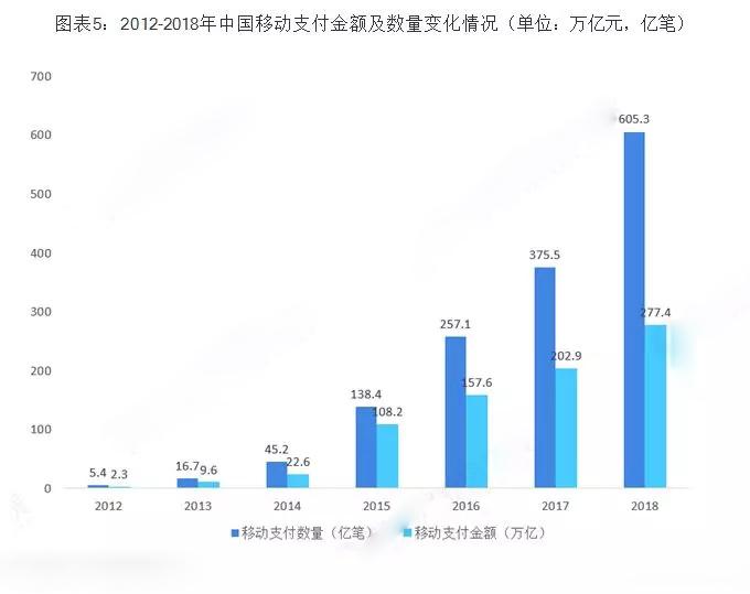 中国移动支付蓬勃发展,全球排名第一,为美国移动支付规模百倍。2013年以来,伴随着支付宝、微信支付等第三方移动支付平台的崛起,中国移动支付蓬勃发展。据中国支付清算协会最新数据显示,2017年,中国移动支付规模达202.93万亿元,全球排名第一,近五年移动支付规模年复合增速高达117.6%;2018年,中国移动支付业务605.3亿笔,金额277.4万亿元,同比分别增长61.2%和36.7%。