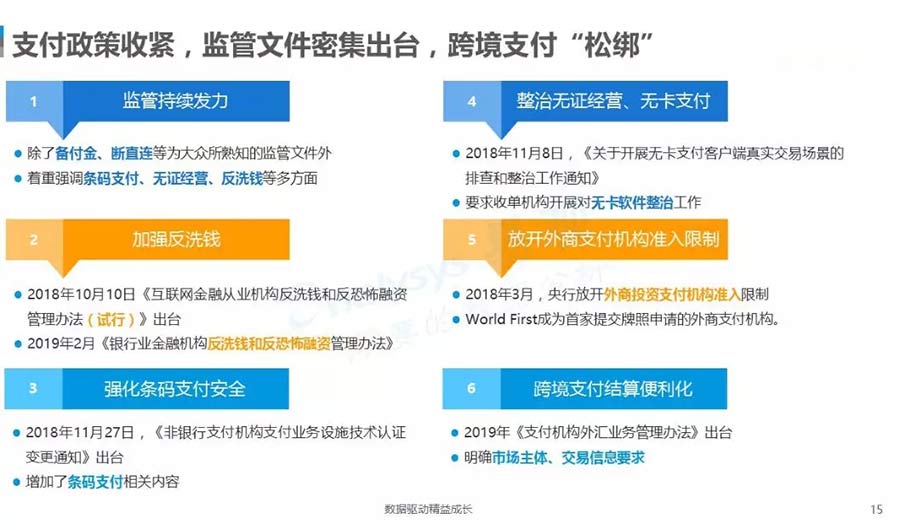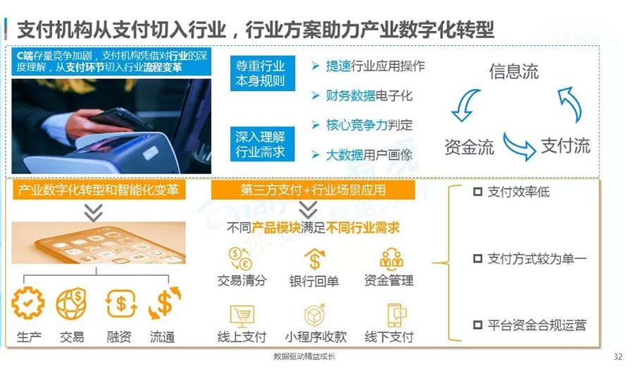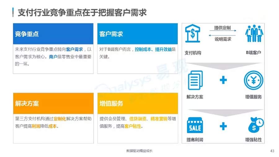未来支付机构竞争的重点在于如何深度把握用户及行业客户的不同痛点和需求。在用户端,需打造支付生态圈,全方位满足用户需求。面对行业客户,需解决客户痛点,深度挖掘用户需求,以支付为入口,向企业输出定制化的解决方案、增值服务,助力行业客户提升效益降低成本。当前支付行业已经结束高速增长期,进入平稳发展期,支付产业链各类型机构商业模式交叉增多。接下来,支付机构需加强上下游企业合作,在支付产业链上延伸拓展服务,并根据身发展特点及优势选择不同的发力点,建立业务优势,提高深度服务于行业级客户的能力,方能在转型深水中谋得一席之地。
