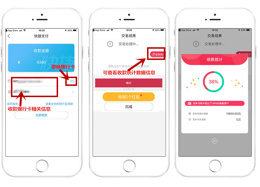 2.绑定完成之后退回,返回快捷支付收款界面,输入需要收款的金额之后,可以直接选择绑定的快捷支付银行卡,配合输入手机验证码即可完成收款操作。在完成收款操作界面,有一个收款统计可以查看,本月所有的交易汇总。