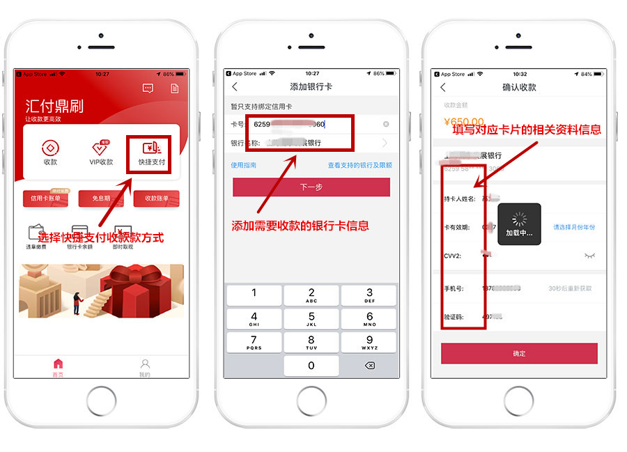 鼎刷的快捷支付操作,不需要pos机,直接在APP上面就可以进行收款。快捷支付收款功能首次使用需要添加绑定银行卡,在添加绑定快捷支付银行卡的时候,需要填写银行卡的相关信息和手机验证码才能正常绑定。